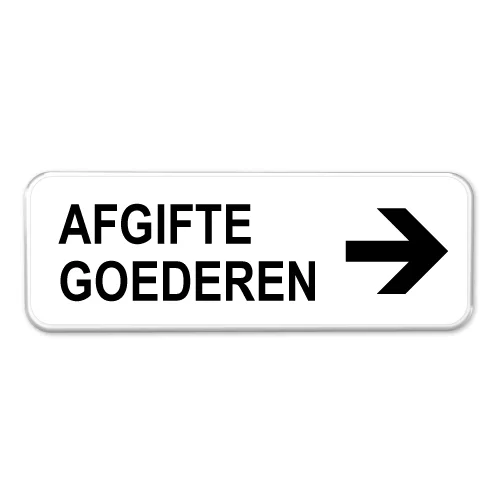 Bord Afgifte goederen pijl rechts Stevig aluminium bord met dubbel omgezette rand voor een makkelijke bevestiging. Het bord roest niet en gaat jarenlang mee. Onze borden komen uit dezelfde fabriek als waar de verkeersborden in Nederland worden gemaakt. Echte kwaliteit dus! Hieronder vind je meer informatie over het bord en de mogelijke bevestigingen.